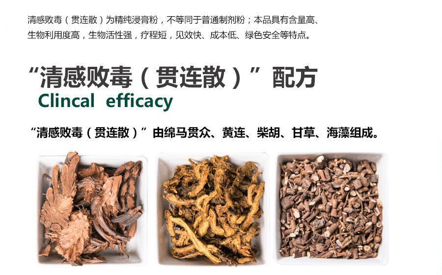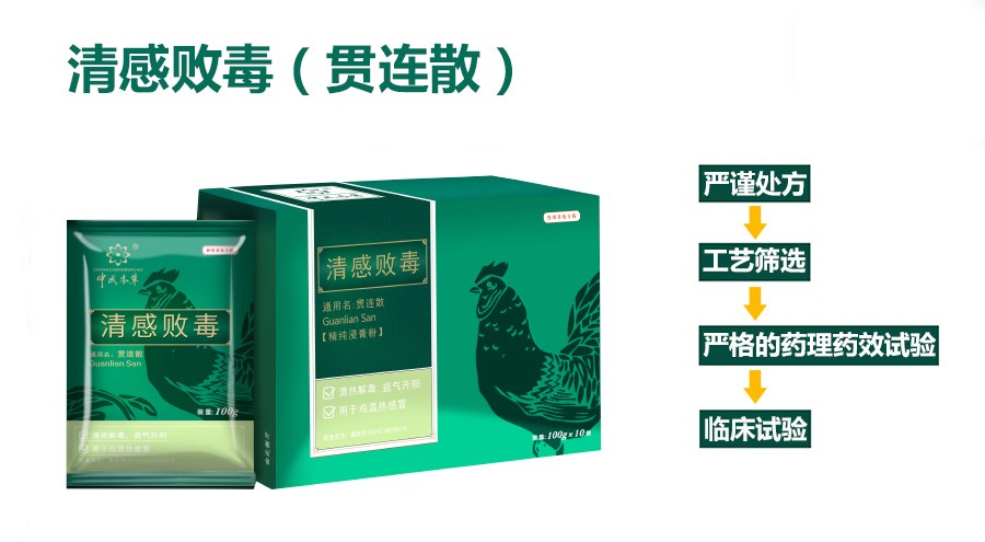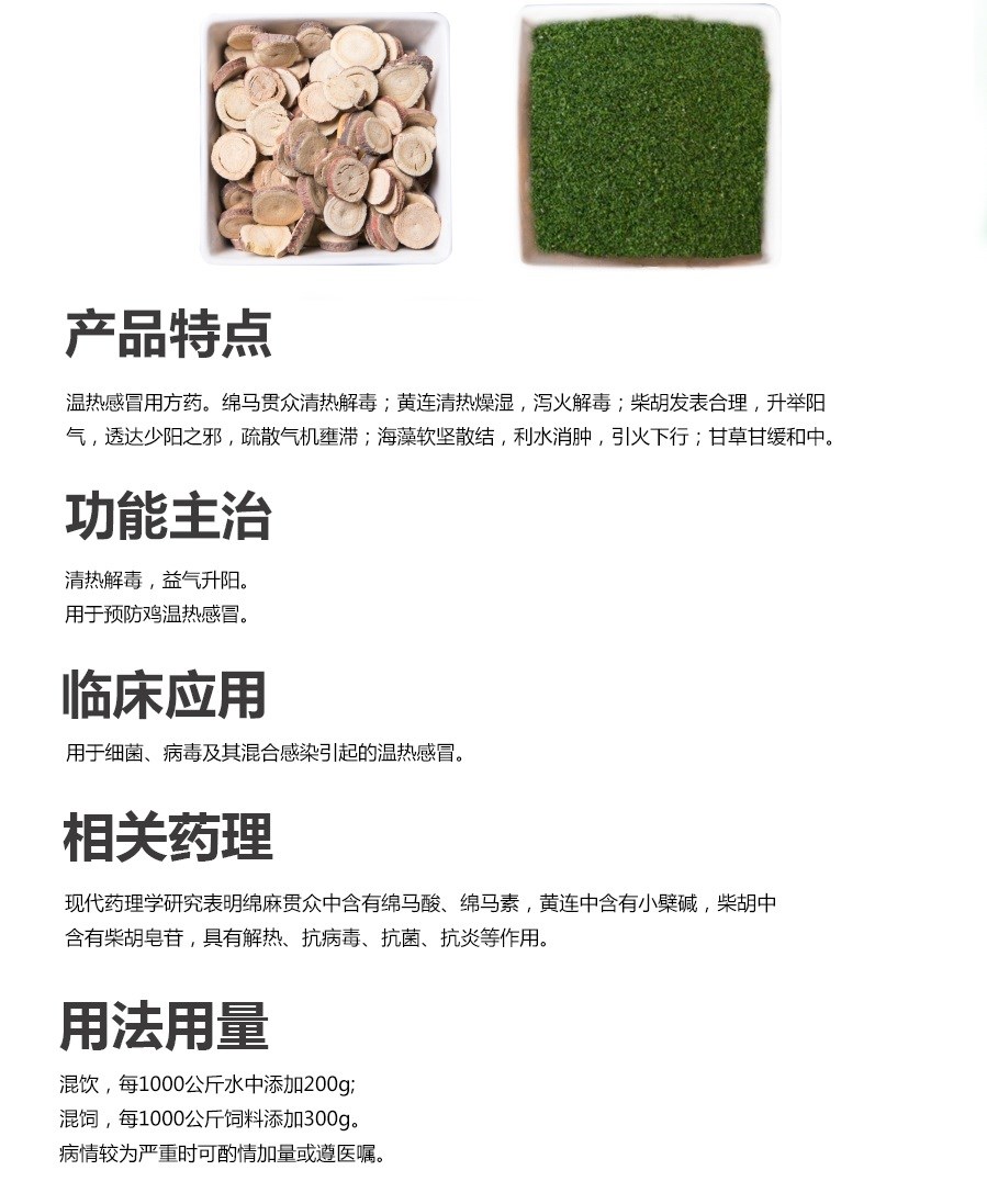 【處方】綿馬貫眾、黃連、柴胡、甘草、海藻。 【功能】清熱解毒,益氣升陽。 【主治】用于預防雞溫熱感冒。 【用法用量】 混飲,每1000公斤水中添加200g; 混飼,每1000公斤飼料添加300g。 病情較為嚴重時可酌情加量或遵醫囑。