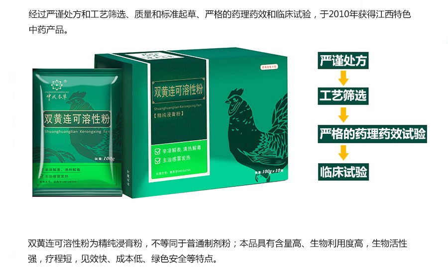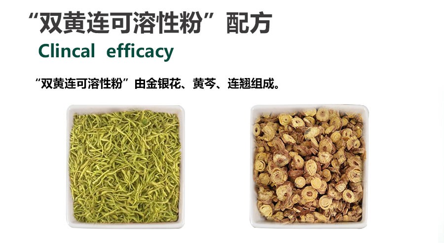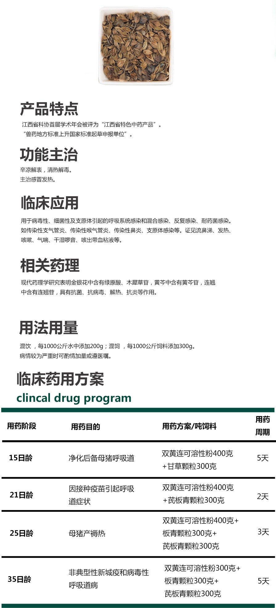 【處方】 金銀花、黃芩、連翹。 【性狀】 本品為黃色至淡棕黃色的粉末。 【功能】 辛涼解表,清熱解毒。 【主治】 感冒發熱 【用法與用量】 混飲,每1000公斤水中添加200g; 混飼,每1000公斤飼料添加300g。 病情較為嚴重時可酌情加量或遵醫囑。