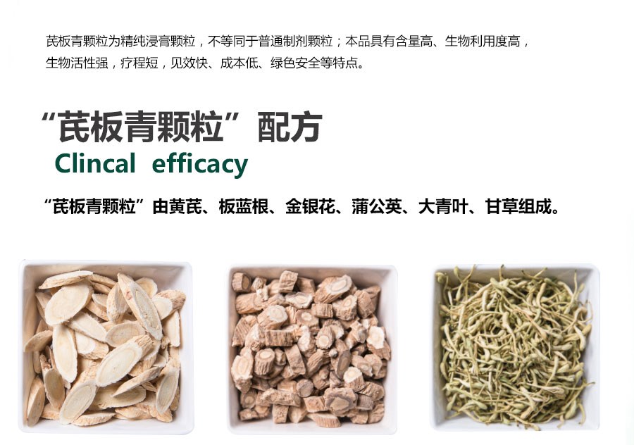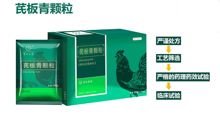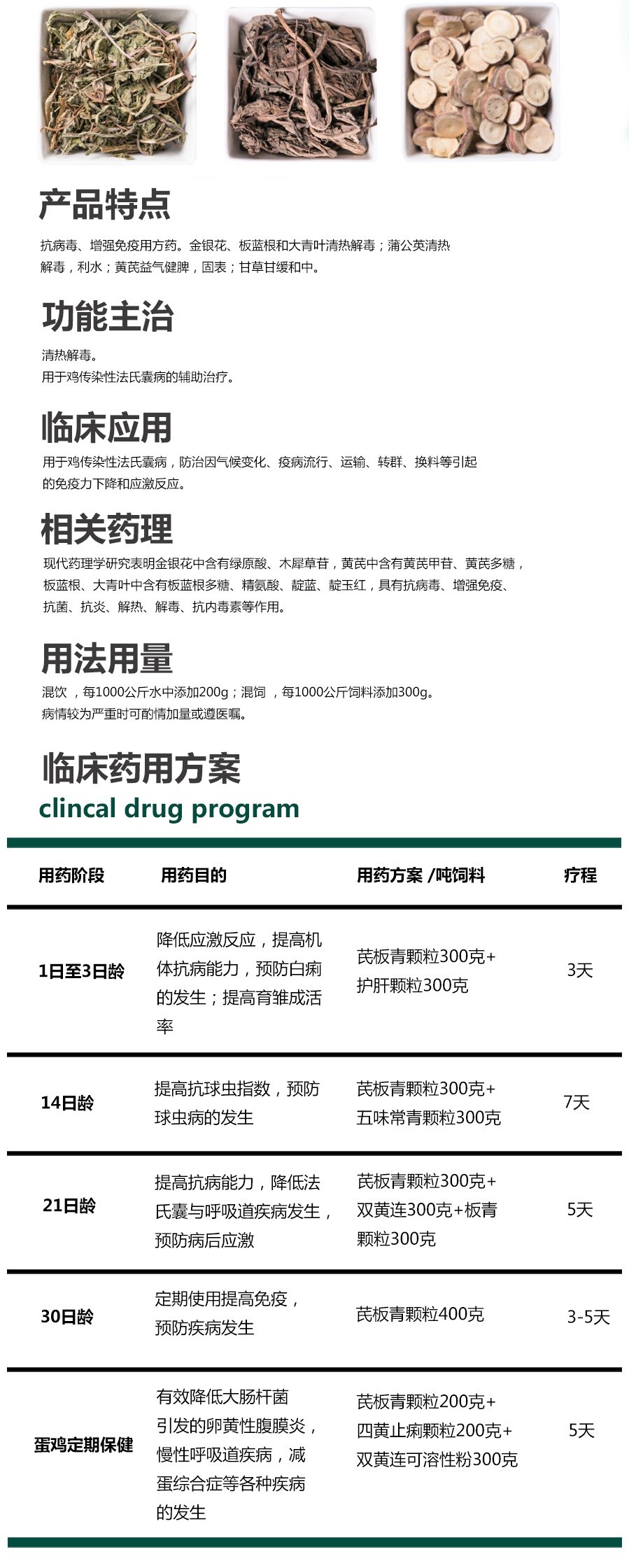 【處方】 黃芪、板藍根、金銀花、蒲公英、大青葉、甘草。 【性狀】 本品為棕黃色的顆粒;味微甜。 【功能】 清熱解毒。 【主治】 用于雞傳染性法氏囊病的輔助治療。 【用法與用量】 混飲,每1000公斤水中添加200g; 混飼,每1000公斤飼料添加300g。 病情較為嚴重時可酌情加量或遵醫囑。