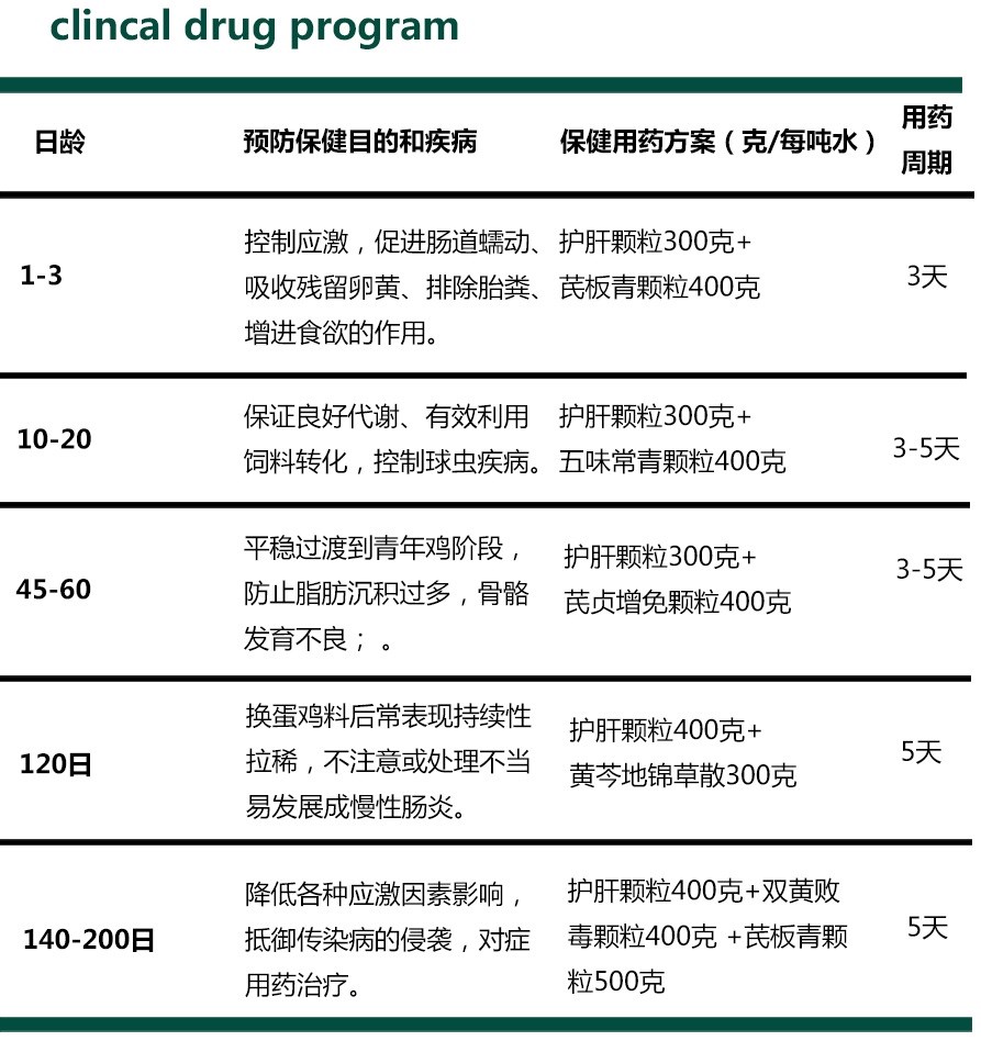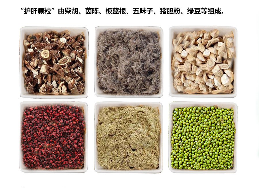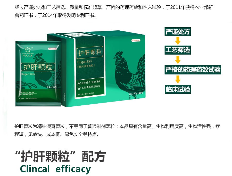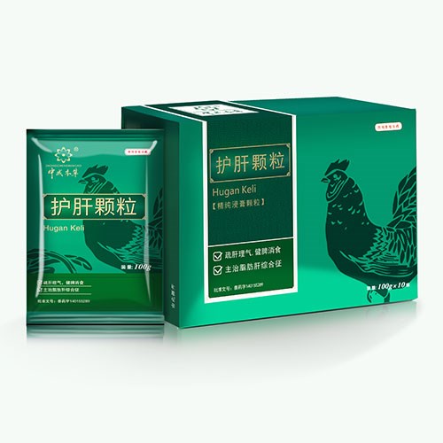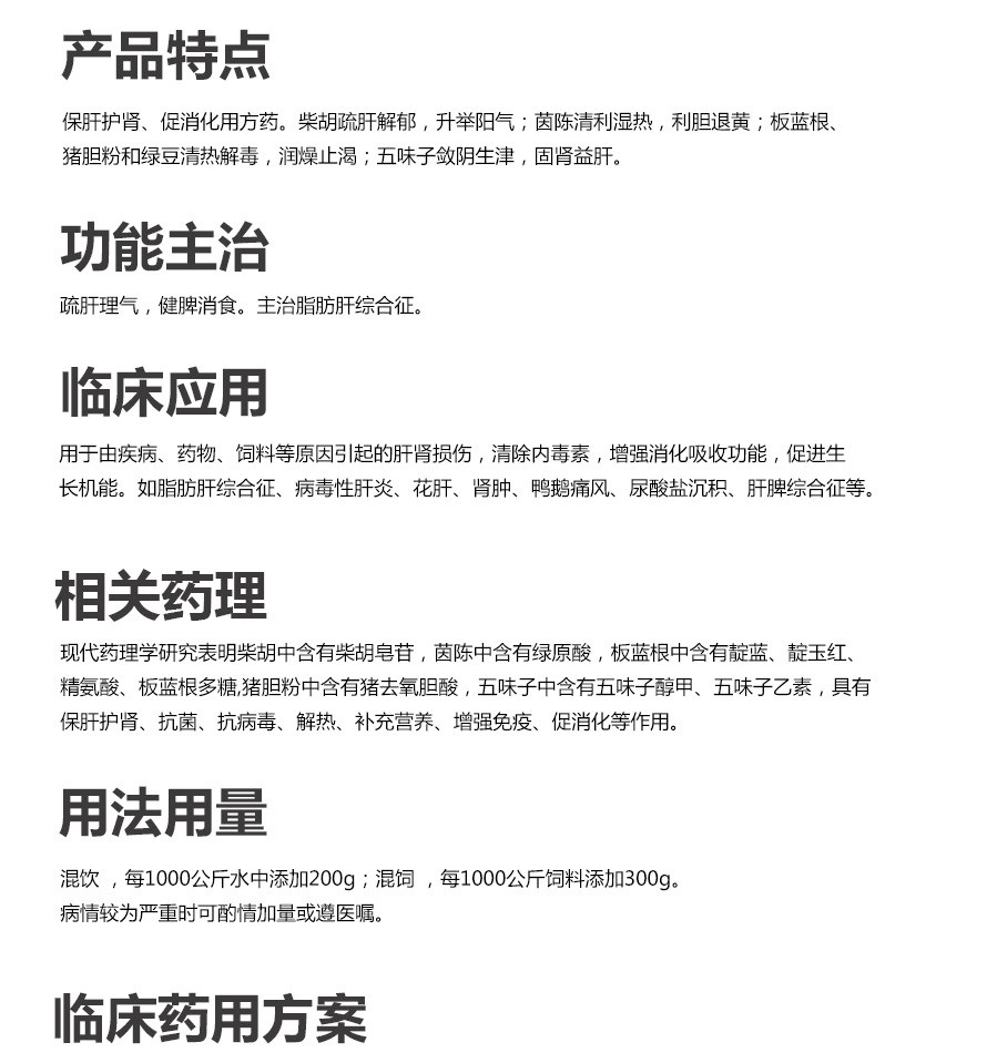 【處方】 柴胡、茵陳、板藍根、五味子、豬膽粉、綠豆。 【性狀】 本品為棕色至棕黃色顆粒;味苦。 【功能與主治】疏肝理氣,健脾消食。 主治脂肪肝綜合征。 【用法與用量】 混飲,每1000公斤水中添加200g; 混飼,每1000公斤飼料添加300g。 病情較為嚴重時可酌情加量或遵醫囑。