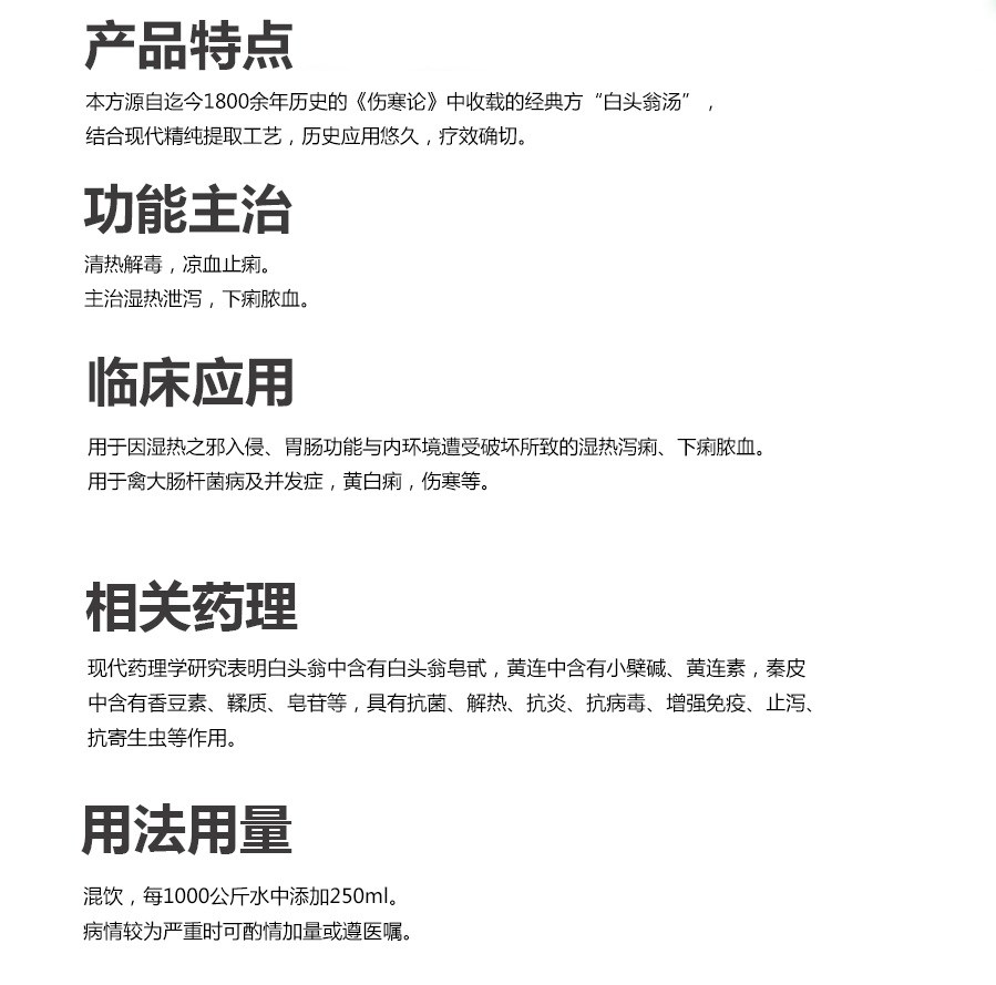 本方源自迄今1800余年歷史的《傷寒 論》中收載的經(jīng)典方“白頭翁湯”,結(jié)合現(xiàn)代精純提取工藝,歷史應(yīng)用悠久,療效確切。。