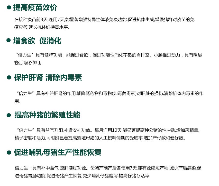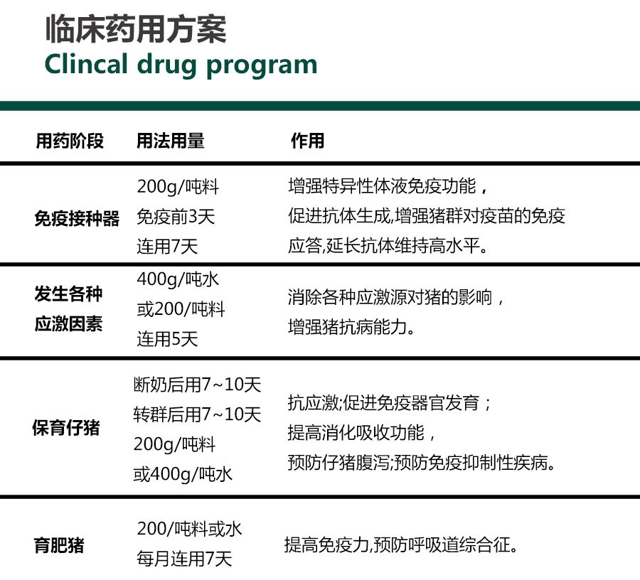 用于應激綜合征、免疫力低下及免疫抑制性疾病。配合疫苗使用,增強疫苗免疫效果。