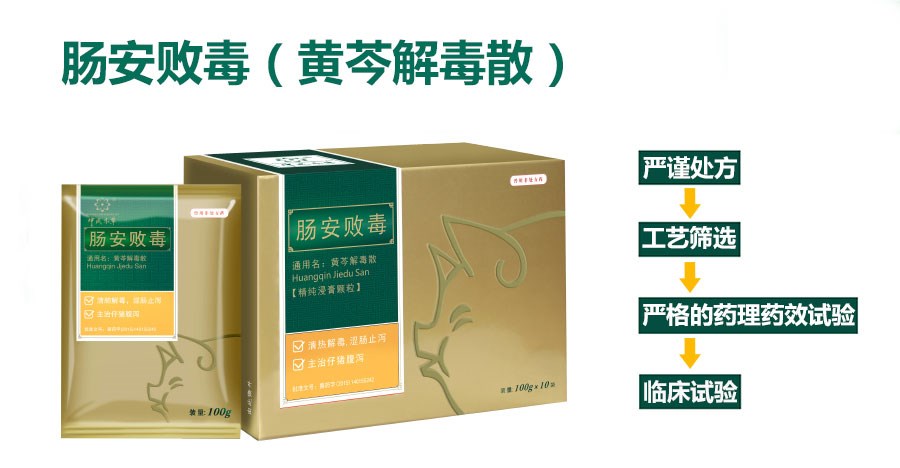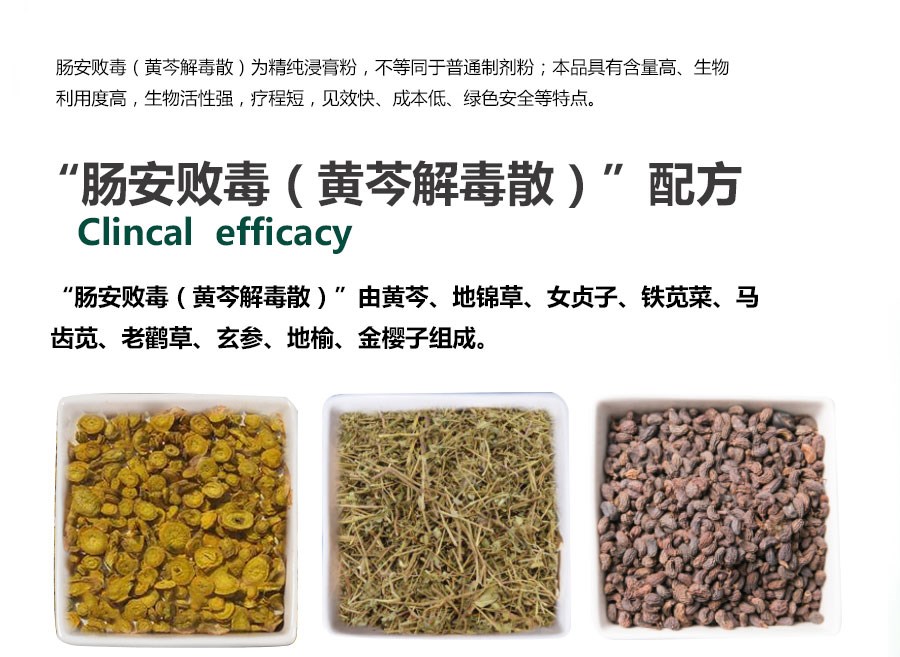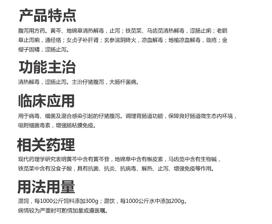 【處方】黃芩、地錦草、女貞子、 鐵莧菜、馬齒莧、老鸛草、玄參、 地榆、金櫻子。 【性狀】本品為灰棕色粉末;氣微,味微苦。 【功能】清熱解毒,澀腸止瀉。 【主治】仔豬腹瀉,大腸桿菌病。 【用法用量】 混飼,每1000公斤飼料添加300g; 混飲,每1000公斤水中添加200g。 病情較為嚴重時可酌情加量或遵醫囑。