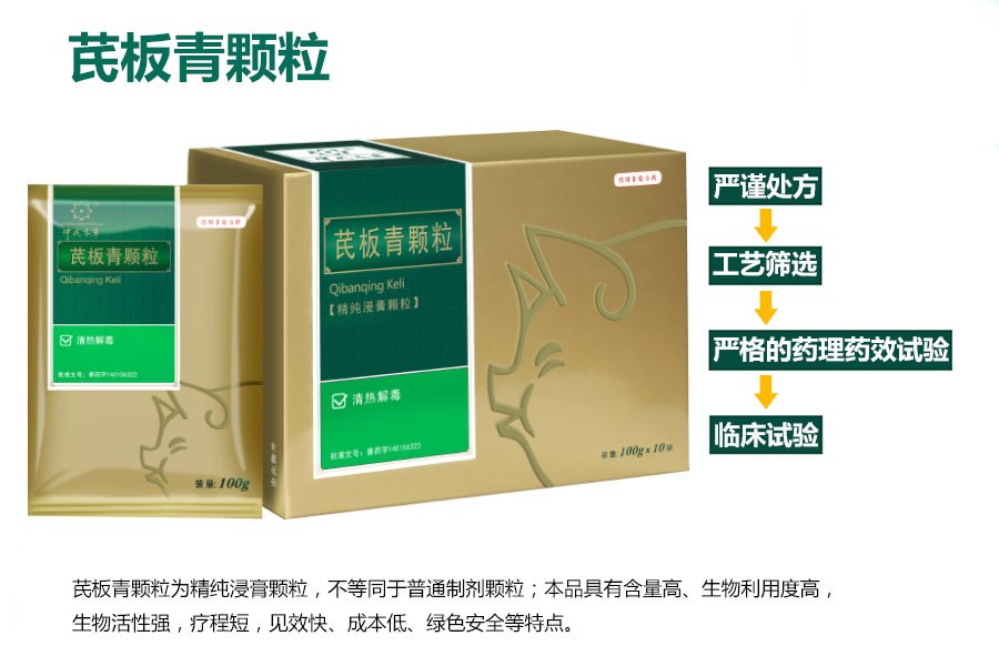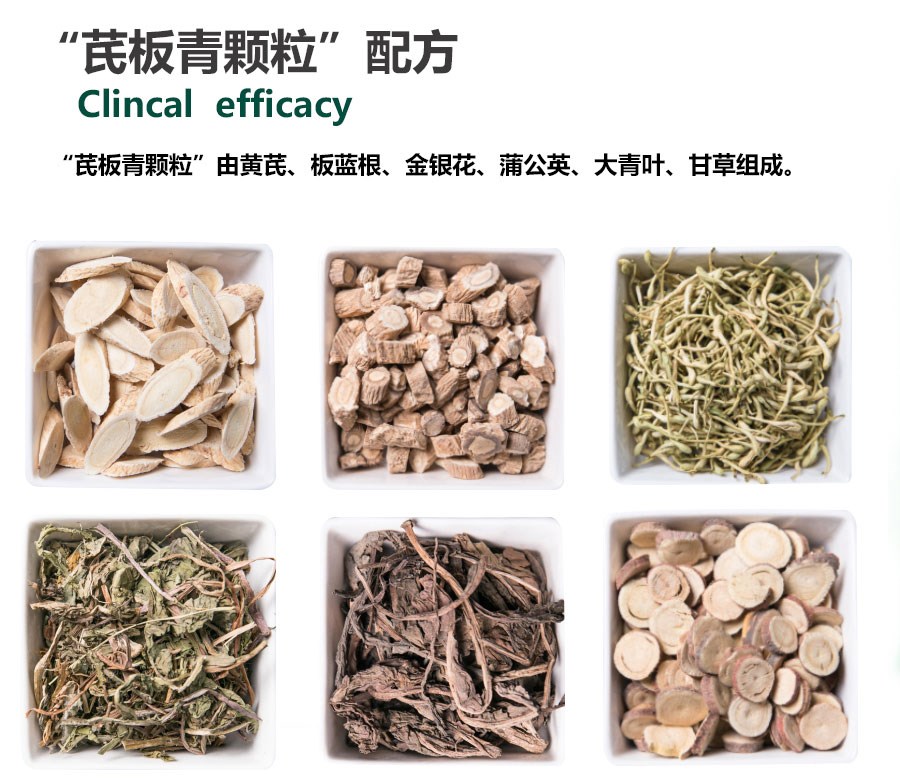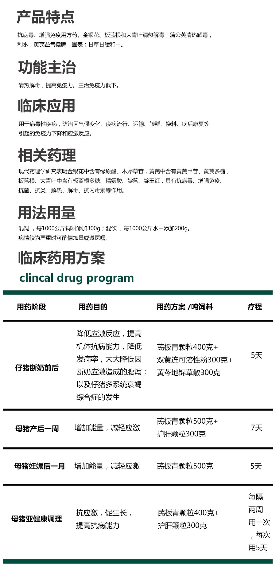 【處方】 黃芪、板藍根、金銀花、蒲公英、大青葉等。 【性狀】本品為棕黃色的顆粒;味微甜。 【功能】清熱解毒,提高免疫力。 【主治】免疫力低下。 【用法與用量】 混飼,每1000公斤飼料添加300g; 混飲,每1000公斤水中添加200g。 病情較為嚴重時可酌情加量或遵醫囑。