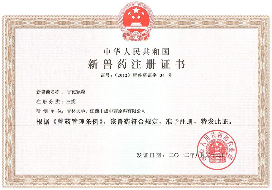 我公司“香芪顆粒”榮獲國家三類新獸藥證書 |