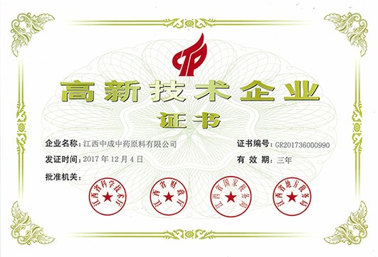 據(jù)最新修訂的《高新技術(shù)企業(yè)認(rèn)定管理辦法》(國(guó)科發(fā)火〔2016〕32號(hào))和《高新技術(shù)企業(yè)認(rèn)定管理工作指引》(國(guó)科發(fā)火〔2016〕195號(hào))文件規(guī)定,經(jīng)審定,江西中成中藥原料有限公司符合高新技術(shù)企業(yè)認(rèn)定條件,被認(rèn)定為“高新技術(shù)企業(yè)”(證書(shū)編號(hào):GR201736000990)。